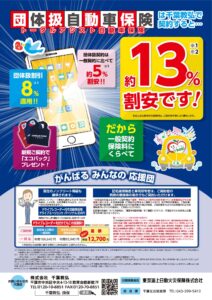 - 上記の内容は団体扱自動車保険等の概要を説明したものです。ご契約にあたっては、必ず各社商品パンフレットおよび「重要事項説明書」または「重要事項のご説明 契約概要のご説明・注意喚起情報のご説明」をあわせてご覧ください。また、詳しくは「ご契約のしおり(約款)または(普通保険約款・特約)」をご用意しておりますので、取扱代理店または引受保険会社までご請求ください。ご不明な点につきましては、取扱代理店または引受保険会社にお問合わせください。